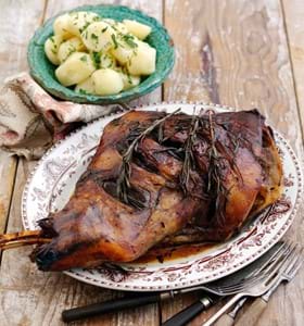 - Remove the joint from the oven and remove the onion and rosemary from the surface of the joint. Cook on a prepared barbecue for 10-15 minutes on each side. Transfer to a large plate, cover and leave to rest for 10-15 minutes. Carve the lamb and serve with a side salad.