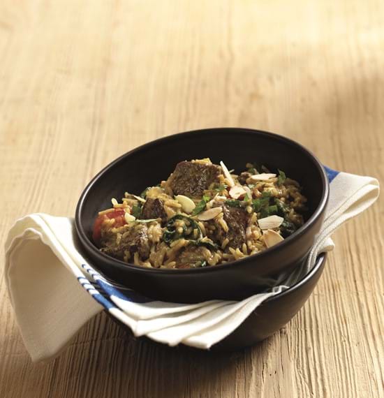 A curry made with beef cubes, Madras curry paste, coconut milk, rice and baby spinach leaves. Great for the weekend, or for an informal dinner party.