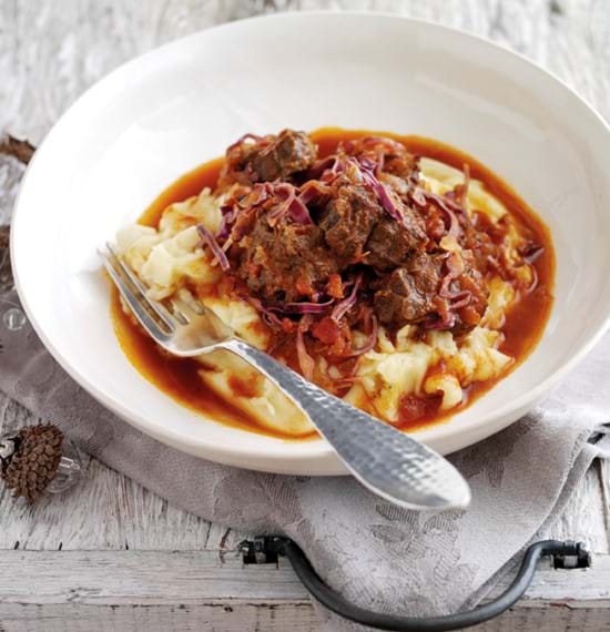 This is a delicious slow cook stew with a bit of a kick. Cubes of braising or stewing beef cubes seasoned with crushed caraway seeds and cooked in a tomato based stock with onions, then flavoured with cayenne pepper and paprika and finished with finely shredded red cabbage. A perfect dish for the cold months ahead.