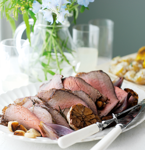 A elegant spring or summer twist to the traditional Sunday roast, topside, silverside or sirloin joint marinated in rosé wine and herbs and served with roasted garlic and red onions for a special family lunch.