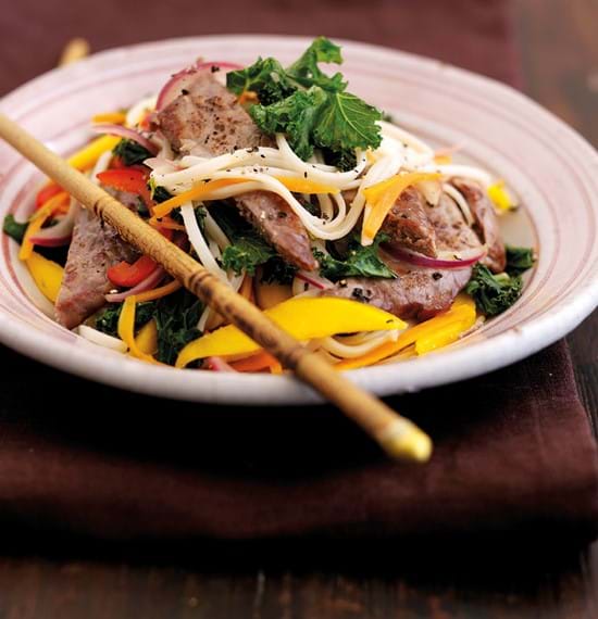 A tangy light salad using thin cut steak strips, stir fried with carrots, red onions, red peppers, kale, fresh mango, limes and cooked noodles.