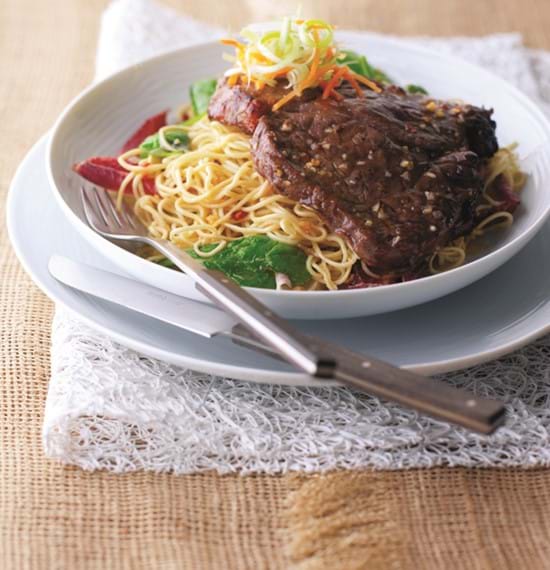 Tasty supper dish cooked in under 15 minutes. Rib eye or sirloin steaks marinated in lime, honey, chilli and garlic. Served with noodles.